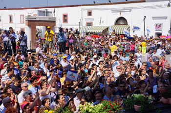 Matera, Italy, 25 June 2012 - His Holiness the Dalai Lama is in Matera at the invitation of his friend and fellow Nobel Peace Laureate, Betty Williams, to support her work here to create a City of Peace, a place where refugees from war, hunger or social, economic, or political upheaval can be rehabilitated. Today, she escorted His Holiness to two of the sites where the work is going on. At the first, new buildings are under way and His Holiness said prayers for the success of the project. From there they drove to the Baronale Palace, Scanzano Jonico where they were welcomed by the Mayor and the President of the Region and took their seats on a stage overlooking the town square under the burning sun.