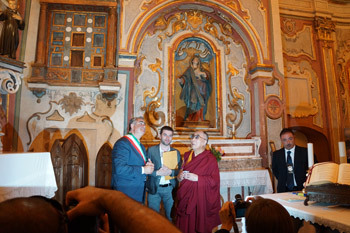 His Holiness the Dalai Lama and the Mayor of Sant’Arcangelo visiting the church of a monastery restored by Betty Williams on June 25, 2012. Photo/Jeremy Russell/OHHDL