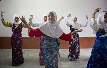 A group of Tibetan Muslim girls rehearsing a dance to be performed during His Holiness the Dalai Lama's planned visit to the Tibetan Muslim community. (Photo by Tenzin Choejor/OHHDL) |