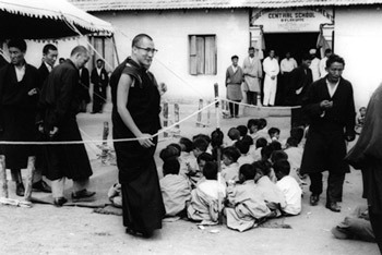 | His Holiness the Dalai Lama visiting the CTS school in Bylakuppe, Karnataka, South India, during a visit in the early 1970's. File photo/OHHDL |