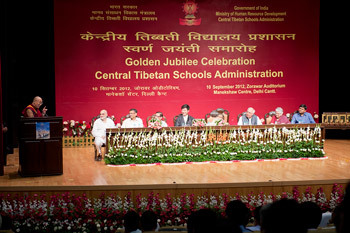 His Holiness the Dalai Lama speaking at the Golden Jubilee Celebration of the Central Tibetan Schools Administration (CTSA) in New Delhi, India, on September 10, 2012. Photo/Tenzin Choejor/OHHDL