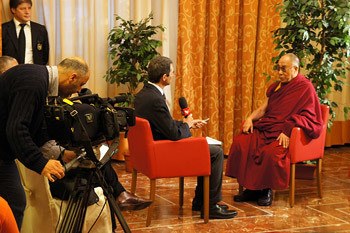 Huy, Belgium, 23 May 2012 - Before leaving his hotel for the teaching venue in Udine, His Holiness the Dalai Lama gave an interview to Dr Sandro Petrone of the Italian television channel RAI. Asked, in the context of an earthquake in Bologna a couple of days ago, what advice he would give people who have suffered natural disasters, His Holiness repeated what he told people he met when he visited Fukushima, Japan, after the earthquake, tsunami and nuclear accident there.