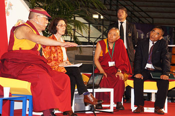 His Holiness asked for questions and the first was whether it is possible that a future Dalai Lama might be a woman. He answered that since the purpose of the Dalai Lama's reincarnation is to serve other people, as he told a Paris magazine in the 1980s, a female reincarnation was possible. He joked that if this happened she would be very attractive in order to be more effective. He also noted that whereas war heroes and dictators have tended to be men, our present time calls for different qualities, such as compassion and understanding, qualities that come more naturally to women. In other replies to students' questions, His Holiness made it clear that from a social and economic point of view he still has sympathy for Marxism, but at the same time he strongly believes in the value of democracy.
