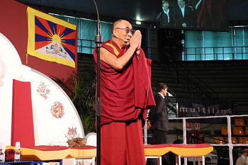 | His Holiness the Dalai Lama speaking at the Palasport Primo Camera in Udine, Italy, on May 23, 2012. Photo/Tenzin Taklha/OHHDL |