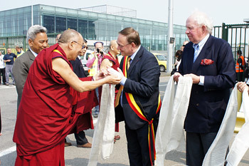 His Holiness the Dalai Lama is welcomed by the Mayors of Huy and Knokke on his arrival at Liège Airport in Belgium on May 23, 2012. Photo/Tenzin Taklha/OHHDL