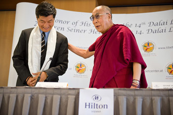 His Holiness the Dalai Lama introduces Kalon Tripa Dr. Lobsang Sangay to journalists at a meeting with members of the press in Vienna, Austria, on May 25, 2012. Photo/Tenzin Choejor/OHHDL
