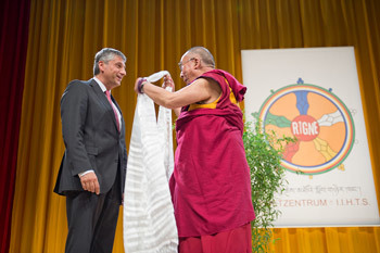 His Holiness the Dalai Lama offers a Tibetan ceremonial scarf to Austrian Foreign Minister Michael Spindelegger during his talk at the Vienna Stadthalle in Vienna, Austria, on May 25, 2012. Photo/Tenzin Choejor/OHHDL
