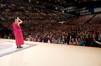 His Holiness the Dalai Lama greeting the audience at the Vienna Stadthalle before his talk "Beyond Religion - Ethics for the Whole World" in Vienna, Austria, on May 25, 2012. Photo/Tenzin Choejor/OHHDL