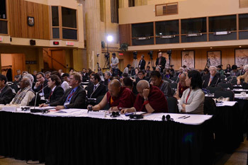 His Holiness then shared his views on two issues for the consideration of the gathering. First was the issue of Tibetan environment, which he said had an impact beyond Tibet. He said this this issue was greater than the political issue of Tibet. The political issue can be resolved but the environment once damaged cannot be recovered, he said. Second was the issue of Tibetan cultural heritage. He said that the preservation of the Tibetan Buddhist culture was in the interest of not only the Tibetans but for the wider world. He added that even non-Buddhist find value in the Tibetan Buddhist culture, recalling a statement by a Scientist at a Mind & Life conference who wished that the Tibetan debating system could be utilized for modern studies.