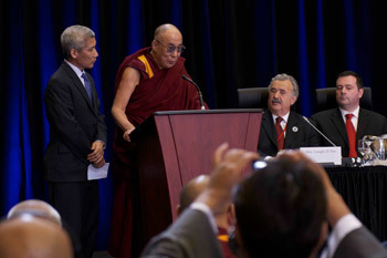 Thereafter, he went to address the inaugural session of the 6th World Parliamentarians’ Convention on Tibet (WPCT). Senator Consiglio Di Nino, Chair of the Canadian Parliamentary Friends of Tibet, welcomed His Holiness and the participants. Thereafter, Mr Jason T. Kenney, Canada's current Minister of Citizenship, Immigration and Multiculturalism, welcomed His Holiness and informed of the Canadian Government’s pride at the contribution of Canadians of Tibetan origin to the social fabric of the nation. He also talked about a new office of religious freedom that Canada was establishing. He said Canada continued to encourage a positive dialogue on the Tibetan issue.