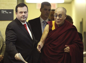 His Holiness the Dalai Lama is welcomed by Minister of Citizenship, Immigration and Multiculturalism Jason Kenney to the "World Parliamentarians' Conventions on Tibet" conference in Ottawa, Canada, on April 27, 2012. Photo/Reuters