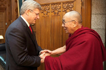 | Canadian Prime Minister Stephen Harper greets His Holiness the Dalai Lama at his office on Parliament Hill in Ottawa on April 27, 2012. Photo/Andrew MacDougall |