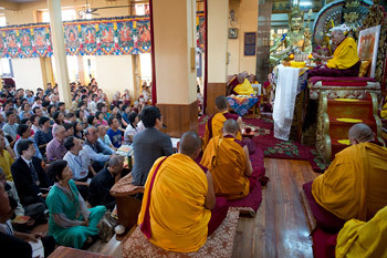 Dharamsala, India, 01 October 2012 (Samuel Ivor, Tibet Post International) - At the request of a group of Taiwanese devotees, His Holiness the Dalai Lama of Tibet commenced the first of four days of teachings on ‘Atisha’s Lamp for the Path to Enlightenment’ to an audience from over 60 counties at the main temple in Dharamshala, India.