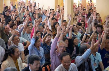 Members of the audience respond to His Holiness the Dalai Lama's question during the first day of his four day teaching at the request of a Taiwainese group in Dharamsala, India, on October 1, 2012. Photo/Tenzin Choejor