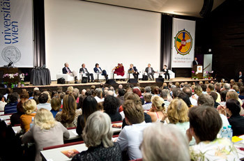 His Holiness the Dalai Lama and fellow panelists during the symposium on Buddhism and science "Mind and Matter - New Models of Reality" at the University of Vienna, in Vienna, Austria, on May 26, 2012. Photo/Tenzin Choejor/OHHDL