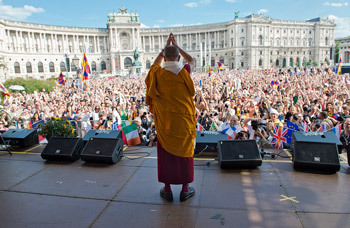 His Holiness the Dalai Lama greeting the crowd of over 10,000 at the European Solidarity Rally for Tibet at the Vienna Heldenplatz in Vienna, Austria, on May 26, 2012. Photo/Tenzin Choejor/OHHDL