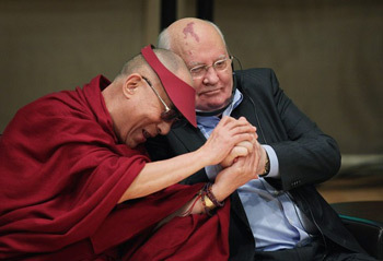 Chicago, Illinois, USA, 25 April 2012 - His Holiness the Dalai Lama began his morning program ias he met separately with President Lech Walesa, Jody Williams, and President Mikhail Gorbachev. They discussed issues of mutual concern, including issues taken up at the 12th World Summit of Nobel Peace Laureates. His Holiness said he regarded President Walesa as a hero as he stood firm against totalitarianism. His Holiness told President Gorbachev that he had single-handedly contributed to a change that had global impact. Kalon Tripa Lobsang Sangay, who is attending the Summit, was present in these meetings.