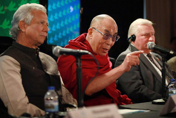 His Holiness the Dalai Lama answers questions during a press conference flanked by Professor Muhammed Yunus (L) and former Polish President Lech Walesa (R) at the 12th World Summit of Nobel Peace Laureates held in Chicago, Illinois, on April 25, 2012. Photo/Getty Images