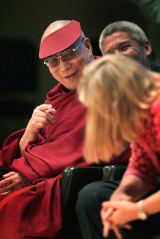 His Holiness the Dalai Lama chats with Professor Jody Williams during a panel discussion at the 12th World Summit of Nobel Peace Laureates held in Chicago, Illinois, on April 25, 2012. Photo/Getty Images
