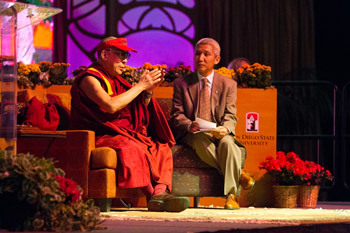 State University listening to His Holiness the Dalai Lama speaking in