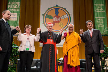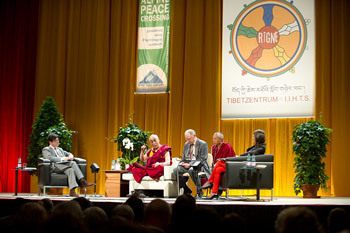 Panelists Rabbi Mag. Schlomo Hofmeister, Mag. Luise Mueller, Archbishop Dr. Alois Kothgasser, His Holiness the Dalai Lama and Dr. Fuat Sanac during an inter-faith dialogue on Harmony in Diversity in Salzburg, Austria, on May 21, 2012. Photo/Tenzin Choejor/OHHDL