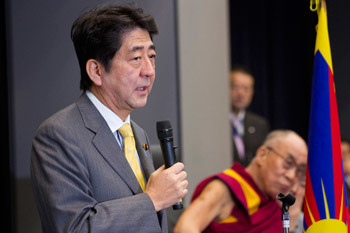 | Former Japanese Prime Minister Shinzo Abe welcomes His Holiness the Dalai Lama to the Japanese Parliament building to address a gathering of parliamentarians in Tokyo, Japan, on November 13, 2102. Photo/Office of Tibet Japan |