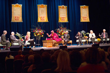 His Holiness the Dalai Lama speaking at the panel discussion on Compassionate Care in 21st Century Medicine in Charlottesvile, VA, on October 11, 2012. Photo/OHHDL