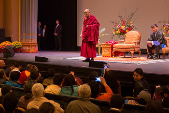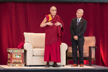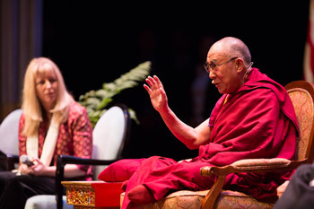 His Holiness the Dalai Lama, with his translator Thupten Jinpa, speaking about Ethics for a Whole World at the Charlottesville Pavilion in Charlottesville, VA, on October 11, 2012.