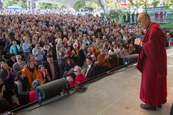Next His Holiness drove a short way to the Charlottesville Pavilion, where 3500 people eagerly waited to hear him speak about Ethics for a Whole World. Mayor Huja made a proclamation declaring 11th October a day of peace in His Holiness’s honour and offering him the keys of the city. A Native American chief offered His Holiness a necklace. Emeritus Professor of Tibetan and Buddhist Studies at the University of Virginia, Jeffrey Hopkins, spoke about how His Holiness’s name has become synonymous with the idea of compassion. He has long recommended dialogue and several to do with medicine, religion and politics began here at Charlottesville that was among the places he visited on his first trip to the USA more than thirty years ago. Prof. Hopkins referred to the more than 50 people in Tibet who have tried to burn themselves to death out of compassion, rather than harm someone else, to draw attention to their desperate situation. He observed that in Vietnam it took two such deaths and the world was aroused; sadly there have been more than 50 in Tibet and the world is not yet aroused.
