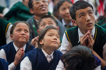 His Holiness the Dalai Lama greeting students on his arrival at the Wynberg Allen School in Mussoorie, India, on September 17, 2012. Photo/Tenzin Choejor/OHHDL