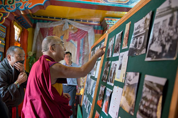His Holiness the Dalai Lama viewing a photo exhibition covering the 50 years of the Tibetan Homes Foundation in Mussoorie, India, on September 17, 2012. Photo/Tenzin Choejor/OHHDL