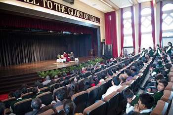 His Holiness was welcomed to Wynberg Allen School by the Principal who introduced him to the audience of students and staff, thanking him for taking time to come despite the school having been late to invite him. His Holiness responded,