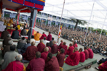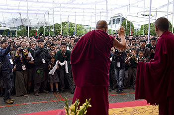 His Holiness then led his audience in reciting the verse he had explained to ceremonially generate the aspiration to attain enlightenment for the sake of all sentient beings, the awakening mind of bodhichitta. At the end he expressed satisfaction that he had been able to give a little explanation of emptiness and bodhichitta, which are the essence of the Buddha’s teaching, adding that the practice of ethics is non-violence, not harming others. He said it is best to help, but at least don’t do harm. He then gave the transmission of Manjushri, the wisdom bodhisattva’s mantra - Om ara patsa na dhi - which he said had helped him when he was studying, and led the students in saying 100 syllables dhi in one breath. Finally he said,