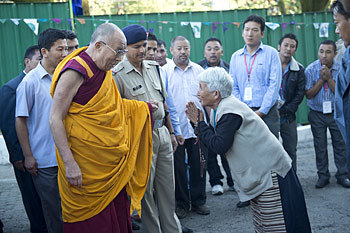 Mussoorie, India, 18 September 2012 - Days of heavy rain gave way at last to clear blue skies, the early morning sun catching the surrounding hill-tops, as His Holiness the Dalai Lama stepped out of the temple where he had been staying to walk down to the Tibetan Homes Foundation School ground. He admired the hibiscus bushes with their white and pink blooms on the way, greeted a 90 year old Tibetan as he reached the school, then took his seat in an armchair before the assembled children. In the front row sat the youngest children, neat and clean in their school uniforms, solemnly trying to pay attention, as, without further ado, His Holiness began his talk.