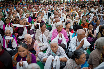 Members of the audience attending His Holiness the Dalai Lama's teachings at Tashi Khyil Monastery in Clementown Tibetan Settlement near Dehra Dun, India, on September 15, 2012. Photo/Tenzin Choejor/OHHDL