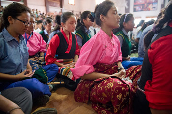 Students at TCV school at Selaquie take a minute to meditate at the start of His Holiness the Dalai Lama's visit in Dehra Dun, India, on September 15, 2012. Photo/Tenzin Choejor/OHHDL