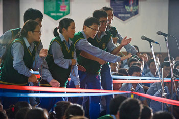 Students debate in traditional style during His Holiness the Dalai Lama's visit to TCV school at Selaquie in Dehra Dun, India, on September 15, 2012. Photo/Tenzin Choejor/OHHDL