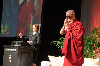 Brown University President Christina Paxson introduces His Holiness the Dalai Lama before his talk on "Human Compassion" at the Providence Convention Center in Providence, RI, on October 17, 2012. Photo/Jeremy Russell/OHHDL