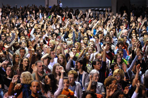 Members of the audience waving their hands in response to His Holiness the Dalai Lama during his talk in Providence, RI, on October 17, 2012. Photo/Mike Cohea/Brown University |