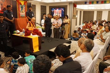 His Holiness was invited to light the inaugural lamp and encouraged Dr Abdul Kalam and Kerala Chief Minister Oommen Chandy to join him in doing so. Then after reciting some words of homage, he began his address.