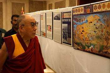 His Holiness the Dalai Lama looking at an exhibition related to Tibet put on by the Friends of Tibet in Kochi, Kerala, on November 25, 2012. Photo/Jeremy Russell/OHHDL