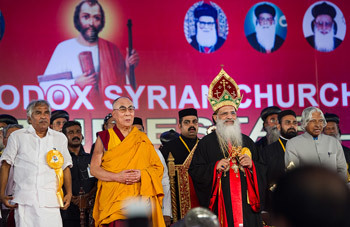 His Holiness the Dalai Lama joins in prayer at the opening of the Malankara Orthodox Syrian Church's Centenary Celebrations in Kochi, Kerala, on November 25, 2012. Photo/Tenzin Choejor/OHHDL
