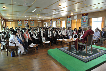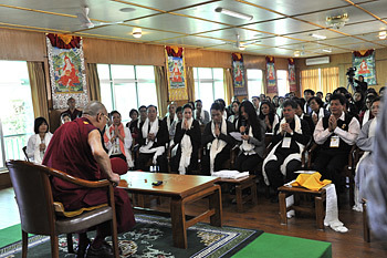 Thekchen Choeling, Dharamsala, 24th September 2012 - A group of 102 visitors from Vietnam, about half from the North and half from the South, members of the Vietnamese CEO's Club, had a meeting with His Holiness the Dalai Lama today, during which he encouraged them to ask him questions. They recalled that it is a year since His Holiness first gave teachings to interested people from Vietnam. On this occasion, however, they said they were looking forward to hearing his advice on how to lead a meaningful life. His Holiness began in his customary way,