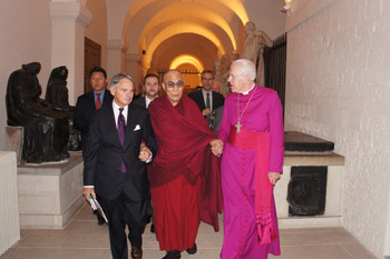 In the Oculus, a historical viewing room under the Cathedral, His Holiness met Prime Minister David Cameron and Deputy Prime Minister Nick Clegg. Both leaders expressed concern for the situation in Tibet and interest in other developments in China. His Holiness advised them to stick to their principles without being deflected by short-term economic considerations. Shortly afterwards, His Holiness met Archbishop Rowan Williams, who has recently announced that he will retire at the end of this year.