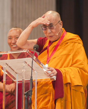 | His Holiness the Dalai Lama during his acceptance speech after being presented the 2012 Templeton Prize at St. Paul's Cathedral in London, UK, on May 14, 2012. Photo/Clifford Shirley |