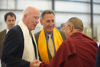 US Senator Patrick Leahy and Vermont Governor Peter Shumlin receive His Holiness the Dalai Lama on his arrival in Burlington, Vermont, on October 12, 2012. Photo/Brett Simison