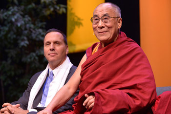 Middlebury College President Ron Liebowitz with His Holiness the Dalai Lama at the Nelson Arena in Middlebury, VT, on October 12, 2012. Photo/Brett Simison |