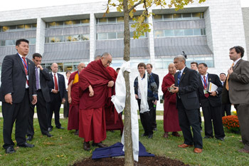 His Holiness the Dalai Lama reciting prayers at a tree planted on a previous visit in Middlebury, VT on October 12, 2012. Photo/Brett Simison |