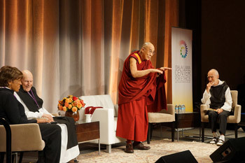 His Holiness the Dalai Lama, joined by Rev. Liz Walker, Friar Thomas Keating and Brother David Steindl-Rast, speaking on "Beyond Religion: Ehtics, Values and Well-Being" in Boston, MA, USA, on October 14, 2012. Photo/Jeremy Russell/OHHDL