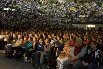 The audience at the College of William and Mary's Kaplan Arena listening to His Holiness the Dalai Lama as he during his talk in Williamsburg, VA, on October 10, 2012. Photo/Jeremy Russell/OHHDL